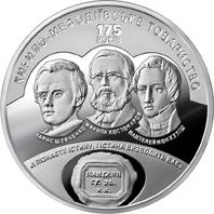 На реверсі монети на дзеркальному тлі зображено портрети членів товариства: Т. Шевченка (ліворуч), М. Костомарова (по центру), П. Куліша (праворуч), унизу – відбиток сургучевої печатки; написи: КИРИЛО-МЕФОДІЇВСЬКЕ ТОВАРИСТВО (угорі півколом), 175/РОКІВ (над портретами), ТАРАС ШЕВЧЕНКО (під портретом Т. Шевченка), МИКОЛА КОСТОМАРОВ (під портретом М. Костомарова), ПАНТЕЛЕЙМОН КУЛІШ (під портретом П. Куліша), «І ПІЗНАЄТЕ ІСТИНУ, І ІСТИНА ВИЗВОЛИТЬ ВАС» (півколом над відбитком печатки).