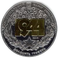 На аверсі монети розміщено: угорі малий Державний Герб України та напис півколом НАЦІОНАЛЬНИЙ БАНК УКРАЇНИ; у центрі - композицію, що символізує перемогу: цифри 1944 (позолочені: локальна позолота, вміст золота в чистоті не менше ніж 0,0005 г. позолочені), над якими - зображення салюту, унизу - лаврова гілка зі стрічкою та зіркою, праворуч над зіркою - рік карбування монети 2014; унизу напис півколом - ДВАДЦЯТЬ ГРИВЕНЬ.На реверсі монети розміщено стилізовану композицію: у центрі на тлі карти зображено в`їзну браму палацового комплексу в м. Корсуні-Шевченківському, по колу розміщено стрілки, що символізують наступальну операцію радянських військ по всьому кільцю оточення угруповання противника, та розміщено написи: 70 років (угорі праворуч), КОРСУНЬ-ШЕВЧЕНКІВСЬКА БИТВА (унизу півколом).