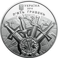 На аверсе монеты размещены: вверху малый Государственный Герб Украины, справа от которого надпись УКРАИНА, под которым год чеканки монеты 2014 и номинал - ПЯТЬ ГРИВЕН, в центре - композиция из четырех мечей, символизирует военное содружество четырех народов: польского, литовского, белорусского, украинского. Место пересечения мечей венчает стилизованный венок из дубовых листьев - символ воинской славы и доблести. Справа на монете размещен логотип Монетного двора Национального банка Украины.На реверсе монеты изображена символическая композиция битвы, в основе которой - стилизованные фрагменты полотна `Битва под Оршей`, созданного неизвестным участником битвы, справа изображен князь Константин Острожский и размещены стилизованные надписи: БИТВА/ПОД/ОРШЕЙ (вверху слева), 500/ЛЕТ (внизу справа).