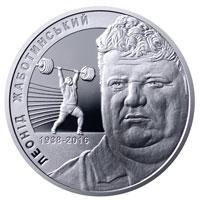 На аверсе монеты размещены: вверху на рельефном фоне - малый Государственный Герб Украины, под которым надпись УКРАИНА; фигура спортсмена с победно поднятыми руками возле штанги; слева от него на зеркальном фоне ? стилизованное спортивное табло, на котором отображены олимпийский и мировой рекорды; справа - год чеканки монеты и номинал 2018/2/ГРИВНІ, логотип Банкнотно-монетного двора Национального банка Украины (внизу).На реверсе монеты изображен портрет Леонида Жаботинского, слева от которого на зеркальном фоне - фигура спортсмена со штангой (покорение веса с толчка); годы его жизни в 1938 ? 2016 и надпись полукругом ЛЕОНИД ЖАБОТИНСКИЙ.