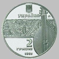 На аверсе монеты справа изображена бандура на фоне горизонтальной орнаментальной полосы, над которой размещен малый Государственный Герб Украины, надпись УКРАИНА и логотип Монетного двора Национального банка Украины, под полосой - надписи в три строки: 2, ГРИВНЫ, 2003.На реверсе монеты изображен слепой кобзарь с музыкальным инструментом в руках, слева в две строки годы жизни 1803 - 1890 и надпись полукругом ОСТАП ВЕРЕСАЙ.