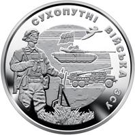 На аверсе монеты размещены: вверху – надпись УКРАИНА (полукругом), в центре на зеркальном фоне – эмблема сухопутных войск ВСУ, слева от которой – малый Государственный Герб Украины, справа – нарукавный знак сухопутных войск ВСУ; под эмблемой: год чеканки монеты – 2021 и номинал – ДЕСЯТЬ ГРИВЕН (полукругом); логотип Банкнотно-монетного двора Национального банка Украины (внизу справа от эмблемы сухопутных войск ВСУ).На реверсе монеты изображен украинский воин с оружием (слева) и размещена стилизованная композиция: на фоне камуфляжа военная техника; на зеркальном фоне надписи: СУХОПУТНЫЕ ВОЙСКА ВСУ (полукругом справа).