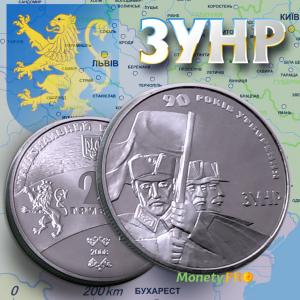 03.11.2008 НБУ увів в обіг пам'ятну монету "90 років утворення Західно-Української Народної Республіки" номіналом 2 гривні. Купити монету "90 років утворення ЗУНР" можна в нашому інтернет магазині >>