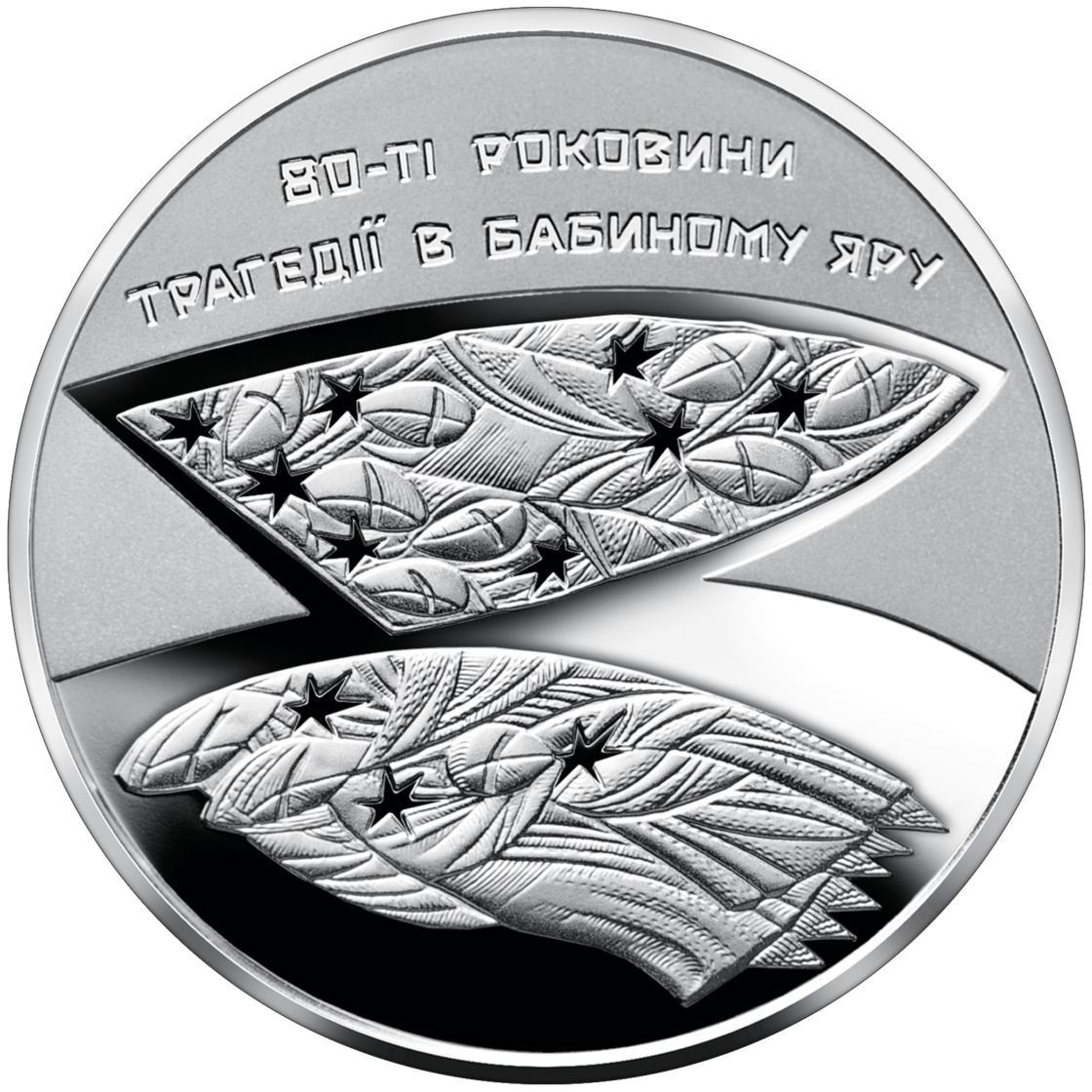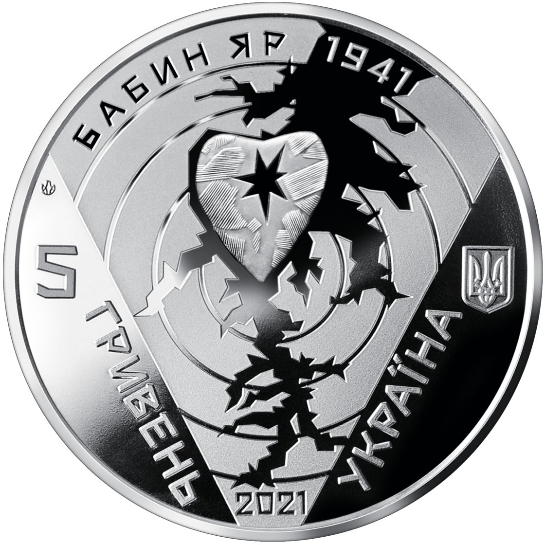 На аверсі монети розміщено: малий Державний Герб України (праворуч), під яким вертикальний напис під кутом УКРАЇНА; ліворуч номінал – 5 ГРИВЕНЬ (вертикально під кутом); у центрі на тлі концентричних кіл, що нагадують мішень, та фрагмента топографічного зображення Бабиного Яру, що нагадує цівки крові, –стилізована композиція – пронизане кулею серце; написи: БАБИН ЯР 1941 (угорі півколом), рік карбування монети 2021 (унизу); логотип Банкнотно-монетного двору Національного банку України (угорі ліворуч).На реверсі монети зображено художньо-образну композицію, що відображає трагедію Бабиного Яру, – антропоморфні фігури, що нібито лежать під землею та уособлюють розстріляні сім’ї. Угорі розміщено напис: 80-ТІ РОКОВИНИ/ТРАГЕДІЇ В БАБИНОМУ ЯРУ.
