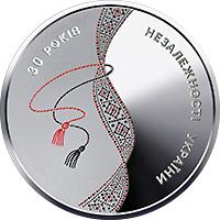 На реверсі монети зображено кольорову вишивану стрічку (використано тамподрук), що символізує код нації і нагадує ДНК, яка є матеріальним носієм генетичної інформації, тобто забезпечує збереження, передавання і відтворення інформації, та півколом розміщено написи: 30 РОКІВ (угорі ліворуч на матовому тлі) НЕЗАЛЕЖНОСТІ УКРАЇНИ (праворуч на дзеркальному тлі).