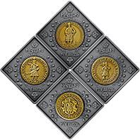Набір з чотирьох пам`ятних монет присвячений пам’яті про героїчну добу нашої історії, яка для українського народу є невичерпним джерелом національної гідності, волелюбності та державних устремлінь, атрибутам влади – козацьким клейнодам. Історична традиція впродовж віків визначила перелік клейнодів Війська Запорозького – прапор, булава, бунчук, печатка, пернач, литаври, сурми, каламар тощо. Саме гетьманські печатки – невід’ємні атрибути влади гетьманів Григорія Лободи, Богдана Хмельницького, Петра Дорошенка та Івана Скоропадського несуть смисловий акцент набору монет і представляють козацьку добу від її зародження до присмерку й уособлюють потужні історичні пласти. Випуск набору “Козацькі клейноди” звертає нашу увагу на героїчну козацьку епоху, в якій український народ досі черпає духовний досвід і звитягу в обороні рідної землі від зовнішніх ворогів.