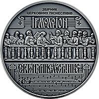 На реверсі монети у центрі зображено наповнений певною ритмікою, об’ємністю фігур хористів, які співають по нотах, фрагмент ікони “Воздвиження Чесного Хреста з родиною Яна Собеського” (1670–1689 рр.), що зберігається в Національному музеї у Львові імені Андрея Шептицького, та розміщено: стилізовані написи: ЗБІРНИК/ ЦЕРКОВНИХ ПІСНЕСПІВІВ/ ІРМОЛОГІОН (угорі) та ноти (під зображенням хористів).