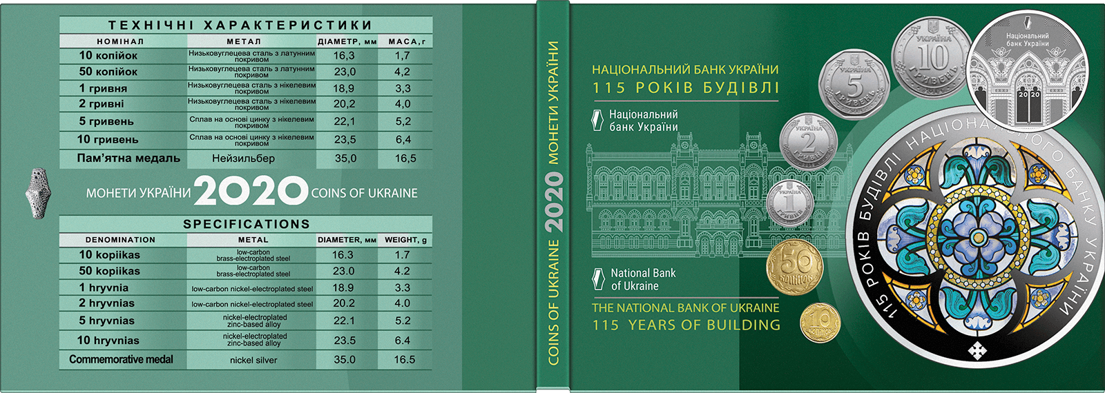 До набору входять розмінні монети України номіналами 10, 50 копійок, обігові монети номіналами 1, 2, 5, 10 гривень та пам’ятна медаль “Національний банк України. 115 років будівлі”.