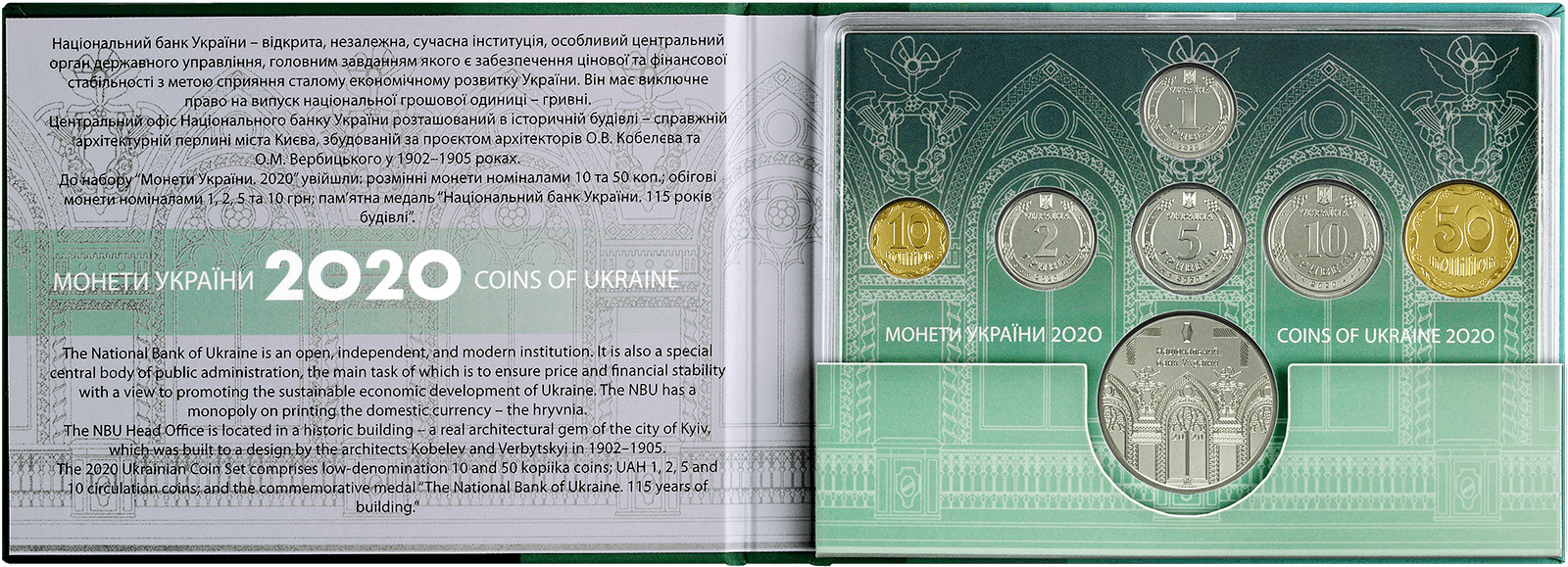Колекційний набір “Монети України 2020 року”, присвячений історичній будівлі – архітектурній перлині міста Києва, збудованій за проєктом архітекторів Олександра Кобелєва та Олександра Вербицького у 1902–1905 рр., – центральному офісу Національного банку України.