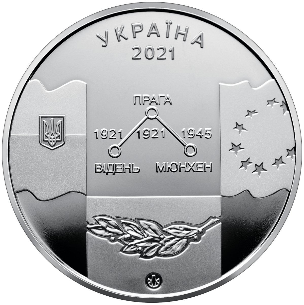 На аверсі медалі на дзеркальному тлі розміщено: угорі – напис УКРАЇНА, під яким рік карбування – 2021; малий Державний Герб України (ліворуч на тлі фрагмента прапора України), фрагмент прапора Європейського Союзу (праворуч); у центрі – схема зміни місця розташування університету в різні часові проміжки та написи: ВІДЕНЬ/1921/ПРАГА/1921/МЮНХЕН/1945; унизу на матовому тлі – лаврова гілка, під якою логотип Банкнотно-монетного двору Національного банку України.