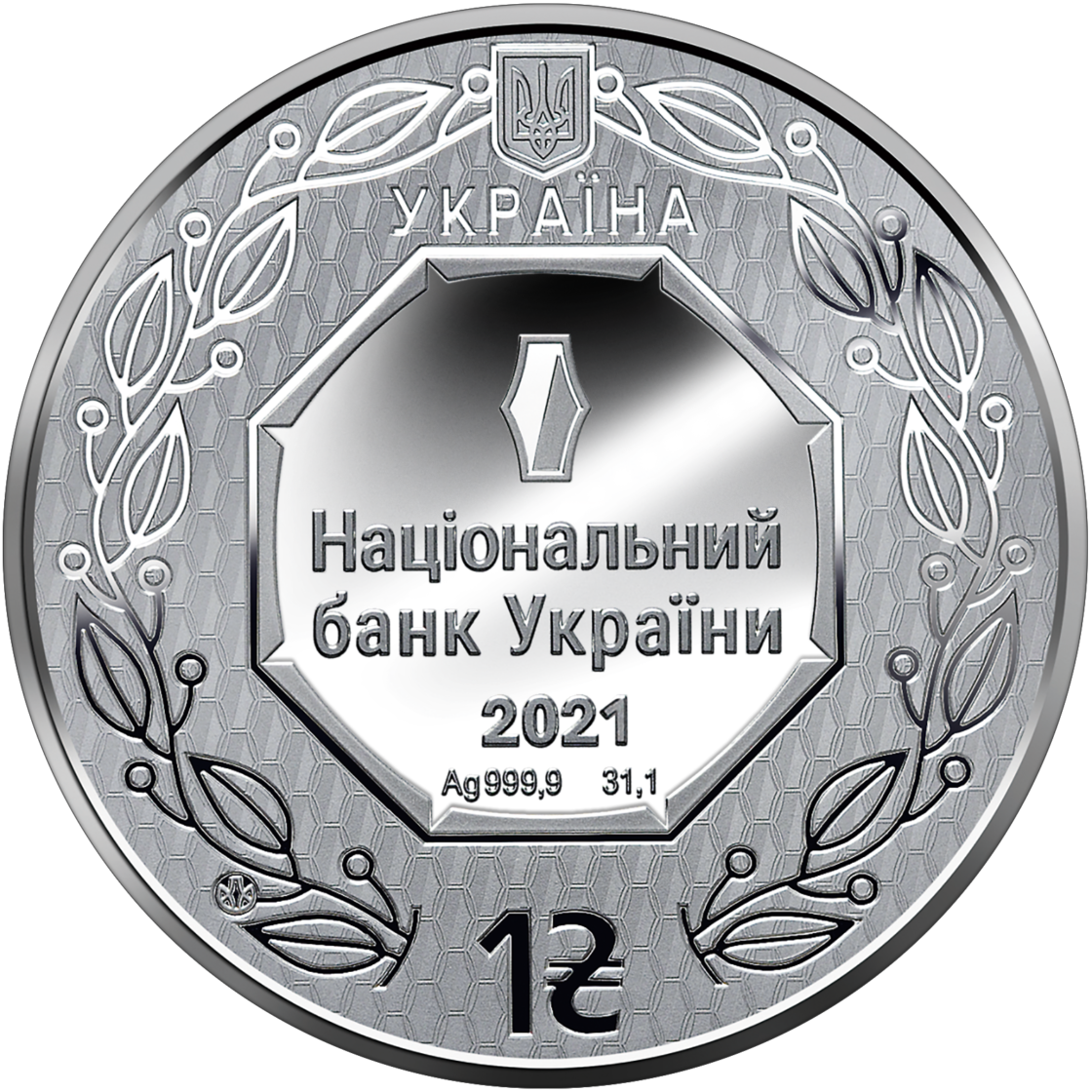 На аверсі монети зображено: Державний герб України (зверху), під яким напис "УКРАЇНА", восьмикутний картуш в центрі монети, в якому логотип НБУ, рік карбування - "2021", позначення металу (Ag), його проба (999,9) та маса в чистоті (31,1). Навколо картуша розташований патерн зі стилізованих давньоруських київських гривень та стилізований лавровий вінок по периметру монети. Внизу монети зазначено номінал "1" і символ гривні. Логотип Банкнотно-монетного двору НБУ розташовано в лівій нижній частині монети.
