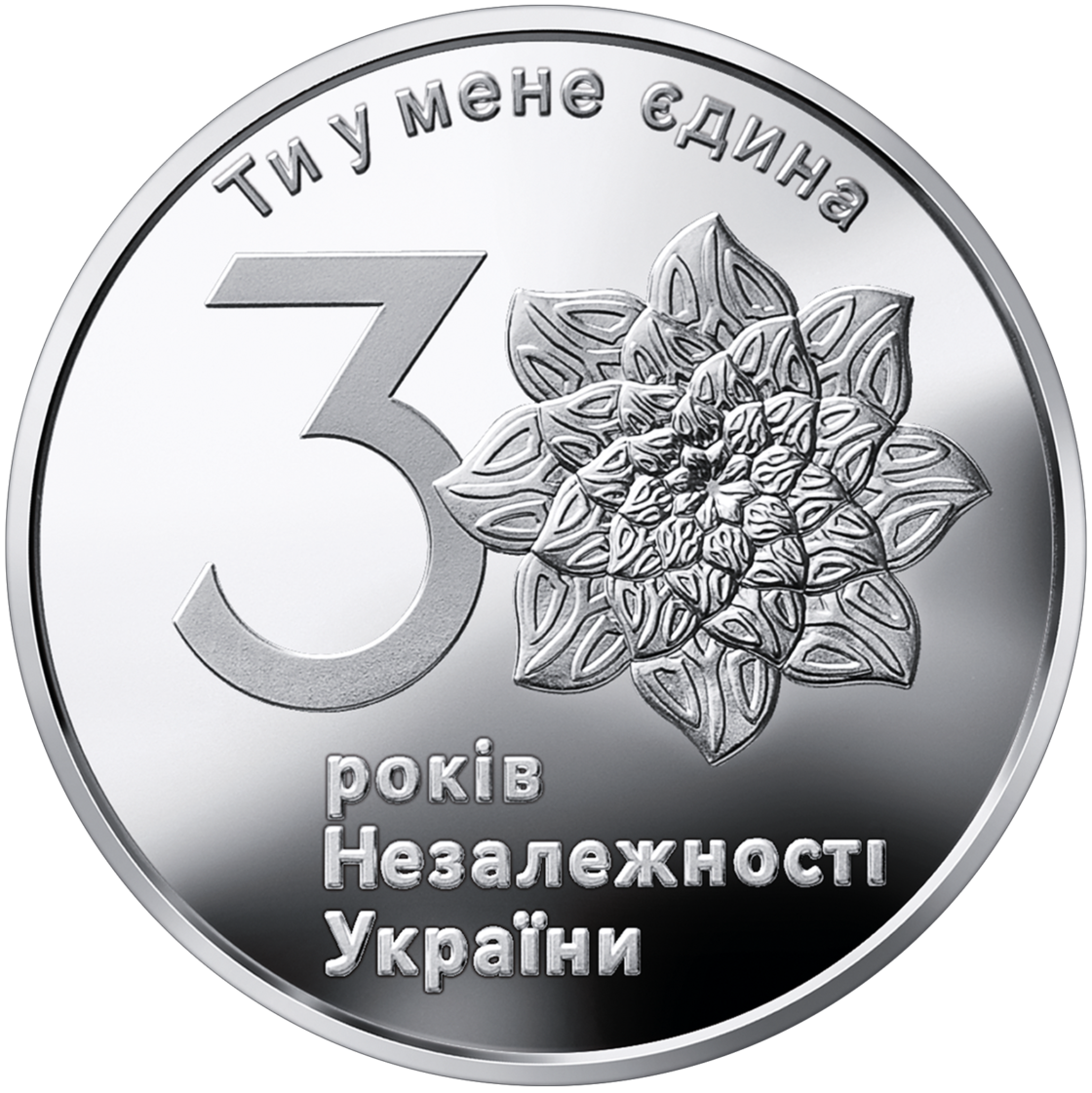 На реверсі монети в її центрі стилізовано зазначено цифру "3" та "0" у вигляді квітки, під якими йде напис "років Незалежності України". Над цифрами зазначено напис "Ти у мене єдина".