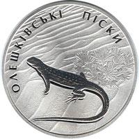 На аверсі монети на матовому тлі пустельного пейзажу зі слідами людини (ліворуч) розміщено: угорі - малий Державний Герб України, під яким напис УКРАЇНА; праворуч рік карбування - 2015; унизу номінал - 10/ГРИВЕНЬ.На реверсі монети на матовому тлі пустельного пейзажу зображено ящірку, угорі півколом - напис ОЛЕШКІВСЬКІ ПІСКИ.