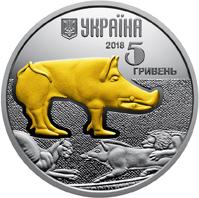 На аверсі монети розміщено: угорі малий Державний Герб України, напис УКРАЇНА, під яким рік карбування монети 2018 та номінал 5/ГРИВЕНЬ; у центрі - позолочене зображення (елемент оздоблення: локальна позолота, вміст золота в чистоті не менше ніж 0,0005 г) вепра - скіфська скульптурна золота фігурка кінця IV ст. до н. е., під яким на матовому тлі сцена терзання з Пекторалі (середина IV cт. до н. е., курган Товста Могила).На реверсі монети ліворуч на дзеркальному тлі зображено вепра, праворуч від якого на матовому тлі - вертикальний напис ВЕПР (угорі) та стилізований фрагмент скіфської пластини із зображенням вепра (праворуч).
