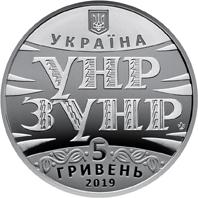 На аверсе монеты размещены: малый Государственный Герб Украины, под которым надпись УКРАИНА; в центре на зеркальном фоне ? шрифтовая композиция из аббревиатур УНР/ЗУНР, буквы которых декорированы характерными орнаментами; внизу на матовом фоне ? номинал 5/ ГРИВЕН, по бокам от которого ? стилизованный растительный орнамент, год чеканки монеты 2019 (внизу) логотип Банкнотно-монетного двора Национального банка Украины (справа на зеркальном фоне).На реверсе монеты на зеркальном фоне размещен фрагмент Акта Злуки: ОТНЫНЕ/ВОЕДИНО СЛИВАЮТСЯ/ВЕКАМИ ОТОРВАННЫЕ ОДНА ОТ ДРУГОЙ/ЧАСТИ ЕДИНОЙ УКРАИНЫ -/ ЗАПАДНО-УКРАИНСКАЯ/ НАРОДНАЯ РЕСПУБЛИКА/ (ГАЛИЧИНА, БУКОВИНА И ВЕНГЕРСКАЯ УКРАИНА) И НАДДНЕПРЯНСКАЯ/БОЛЬШАЯ УКРАИНА./ СБЫЛИСЬ/ ВЕКОВЕЧНЫЕ МІРЇ, КОТОРЫМИ ЖИЛИ И ЗА КОТОРЫЕ УМИРАЛИ/ЛУЧШИЕ СЫНЫ/ УКРАИНЫ. Латентным изображением на тексте просматривается изображение Трезубца. Слева и справа от надписи размещены медальоны с изображениями символов земель: льва - Западной Украины (слева) и Архангела Михаила - центральной Украины (справа), от которых вверх идет стилизованный растительный орнамент в виде лавровых ветвей, внизу надпись полукругом 100 ЛЕТ АКТА ЗЛУКИ.