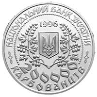 На аверсе монеты в центре круга, образованного бусовым узором, находится изображение малого Государственного герба Украины в обрамлении с двух сторон ветвями калины. Над гербом размещена дата 1996 - год чеканки монеты. По кругу монеты надписи: вверху НАЦИОНАЛЬНЫЙ БАНК УКРАИНЫ, внизу в две строки 200000 КАРБОВАНЦЕВНа реверсе монеты изображен портрет Леси Украинки, по кругу размещены надписи: слева ЛЕСЯ УКРАИНКА, справа 1871-1913 - годы рождения и смерти поэтессы