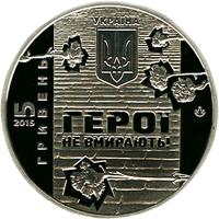 На аверсе монеты размещены: на фоне мостовой вверху надпись УКРАИНА, под которым - малый Государственный Герб Украины; разложены на мостовой гвоздики, символизирующие пролитую кровь героев, надпись ГЕРОИ НЕ УМИРАЮТ!, на зеркальном фоне слева - номинал 5/ГРИВЕН и год чеканки монеты 2015; справа - логотип Монетного двора Национального банка Украины.На реверсе монеты изображена композиция: внизу свечи, пламя которых поднимается вверх на фоне сине-желтого (использована тампопечать) Государственного Флага Украины и символизирует души героев, вверху на зеркальном фоне стилизованная надпись - НЕБЕСНАЯ/СОТНЯ.