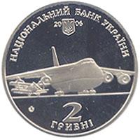 На аверсе монеты в центре композиции изображены самолеты (АН-2 и АН-124 `Руслан`), под которыми размещен номинал монеты-2/ ГРИВНІ; вверху полукругом надпись - НАЦИОНАЛЬНЫЙ БАНК УКРАИНЫ, под ним - малый Государственный Герб Украины и год чеканки монеты 2006, а также логотип Монетного двора Национального банка Украины.На реверсе монеты на фоне стилизованного чертежа изображен портрет Антонова, справа от которого - логотип " АН " и полукругом размещены надписи: ОЛЕГ АНТОНОВ (справа), годы жизни - 1906 1984 (внизу слева).