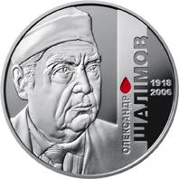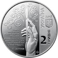 На аверсе монеты размещены: справа - малый Государственный Герб Украины, над которым изображен год чеканки монеты 2018; слева от него - вертикальные надписи: УКРАИНА (вверху) и обозначение номинала 2 ГРИВНЫ (внизу); в центре на зеркальном фоне - стилизованная композиция: рука хирурга со скальпелем в окружении `дерева жизни` и надписи: УЧИСЬ/ в ТЕЧЕНИЕ/ ВСЕГО,/ РАБОТАЙ/ НЕ СЧИТАЯ СЕБЯ/ самым УМНЫМ, И НЕ ОПУСКАЙ РУК/ В СЛУЧАЕ НЕУДАЧИ/ А. ШАЛИМОВ; логотип Банкнотно-монетного двора Национального банка Украины (внизу).На реверсе монеты изображен портрет Александра Шалимова, справа от которого вертикальный надпись АЛЕКСАНДР ШАЛИМОВ, красная капля (использовано тампопечать) и его годы жизни 1918/2006.