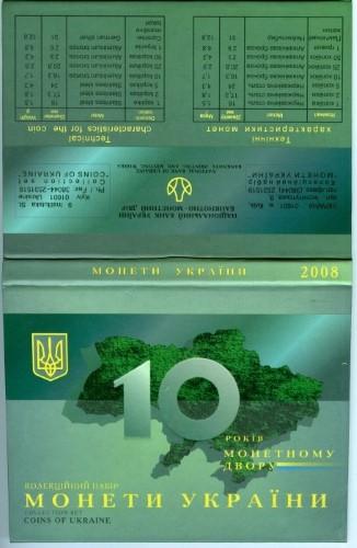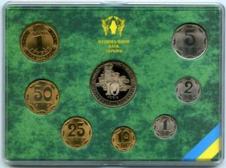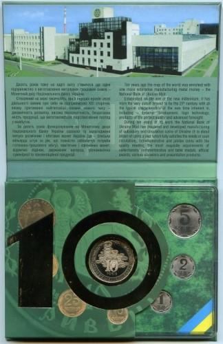 В набор вошли монеты всех номиналов: 1, 2, 5 копеек, 10, 25, 50 копеек, оборотная монета номиналом 1 гривна, а также выпущенный из нейзильбера памятный жетон «10 лет Монетного двора НБУ».