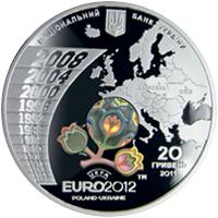 На аверсе монеты размещены: малый Государственный Герб Украины, надпись полукругом НАЦИОНАЛЬНЫЙ БАНК УКРАИНЫ (вверху), карту Европы с надписями КИЕВ и WARSZAWA, на фоне которой голографическое изображение логотипа ЕВРО 2012, под которым надписи: UEFA/EURO 2012™/POLAND-UKRAINE, слева указаны годы проведения чемпионатов Европы по футболу, начиная с 1960 года; справа - номинал и год чеканки монеты 20/ГРИВЕН/ 2011.На реверсе монеты изображена стилизованная композиция - стадион `Олимпийский`, на котором состоится финальная игра чемпионата, и цифры 2012, на фоне которых динамические фигуры футболистов; под композицией размещена надпись ФИНАЛЬНЫЙ ТУРНИР ЧЕМПИОНАТА ЕВРОПЫ/ПО ФУТБОЛУ/2012 г., вверху - герб Киева.