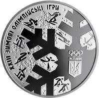 На аверсе монеты размещен стилизованный факел в виде римской цифры XXIII с цветным огнем - одним из символов Олимпийских игр (элемент отделки - голографическое изображение); слева - малый Государственный Герб Украины, над которым надпись УКРАИНА и год чеканки монеты - 2018; справа на фоне стилизованных снежинок отображен номинал - 10/ГРИВЕН.На реверсе монеты изображены: справа - фрагмент стилизованной снежинки, в центре которой знак Национального олимпийского комитета Украины, между кристаллами снежинки на матовом фоне размещены пиктограммы, символизирующие зимние виды спорта; слева - надпись полукругом - ХХІІ ЗИМНИЕ ОЛИМПИЙСКИЕ ИГРЫ.