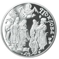 На аверсе монеты изображена композиция из калины, растений, полотенца, на фоне которой - год чеканки монеты 2005, в центре композиции размещен малый Государственный Герб Украины, под ним - гетманские клейноды (пернач и булава) и казацкая сабля. Слева и справа - стилизованные цветы и птицы, между которыми размещены надписи: на монете из серебра - УКРАИНА, 10, ГРИВЕН, а также обозначение металла и его пробы - Ag 925, вес в чистоте - 31,1; на монете из нейзильбера - УКРАИНА, 5 ГРИВЕН. На обеих монетах - логотип Монетного двора Национального банка Украины.На реверсе монеты изображен многофигурную композицию встречи родителями, которые держат икону и каравай, молодых, вверху - Покров. Справа полукругом размещена надпись: ПОКРОВА.