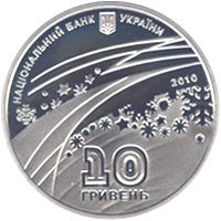 На аверсе монеты размещены: вверху малый Государственный Герб Украины, надпись полукругом НАЦИОНАЛЬНЫЙ БАНК УКРАИНЫ, зимнюю композицию, которая символизирует движение, справа - год чеканки монеты 2010, внизу на рельефном фоне - номинал 10/ГРИВЕН.На реверсе монеты размещена стилизованная голографическая льдинка с цифрами XXI, вокруг которой изображены представители разных видов спорта: биатлона, фристайла, фигурного катания, конькобежного спорта и т. п. и надписи ЗИМНИЕ ОЛИМПИЙСКИЕ ИГРЫ/ ВАНКУВЕР 2010.