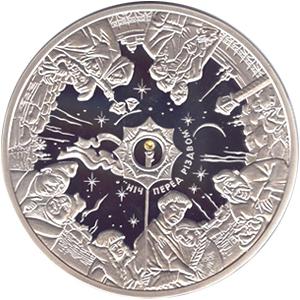 Посвященная творчеству Н.Гоголя, который создал поэтический образ украинского народа, с необыкновенной художественной силой раскрыл его самобытный характер с присущим ему чувством юмора, а лирический образ Украины, созданный им в произведении `Вечера на хуторе близ Диканьки`, навсегда вошел в европейскую литературу. Сюжет одной из самых ярких повестей сборника - `Ночь перед Рождеством` является главной темой композиции монеты. Элементы отделки монеты - сапфир желтый массой 0,06 карата, локальная позолота (содержимое золота - 0,000048 г).